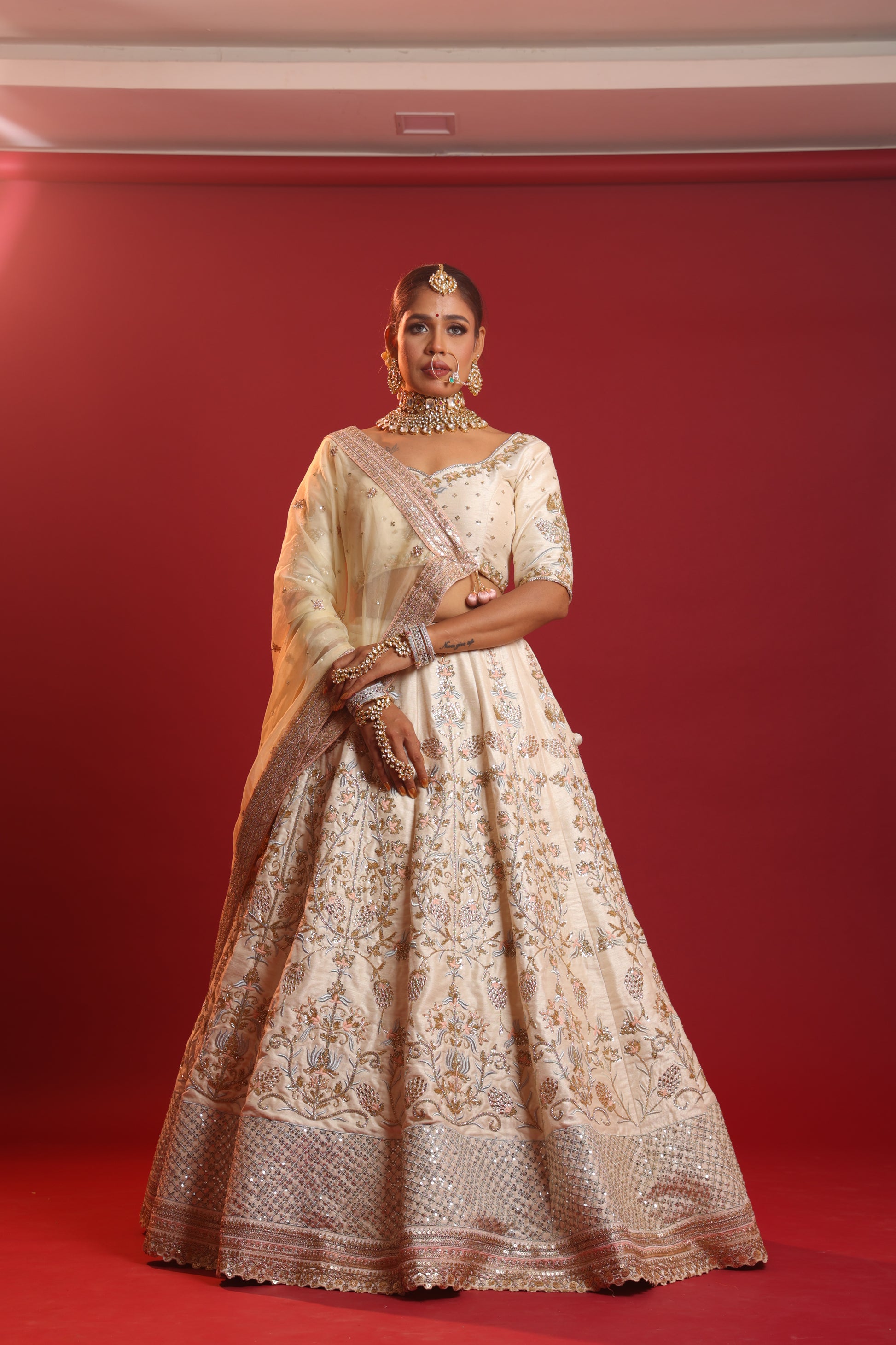 Accessories: Completing the ensemble with traditional jewelry such as Kundan or Polki sets, gold or pearl jhumkas (earrings), bangles, and a maang tikka (forehead ornament) enhances the royal appeal of the Bridal Beige Mughal Lehenga.