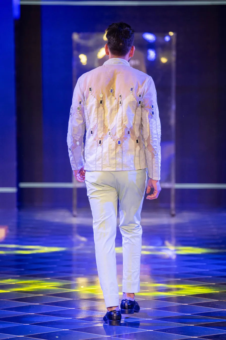 Shisha mirrorwork (a glass disc embroidery technique rooted in traditional "Shisha" craft) intricately stitched across the placket, cuffs, and torso, lending a radiant, prismatic glow